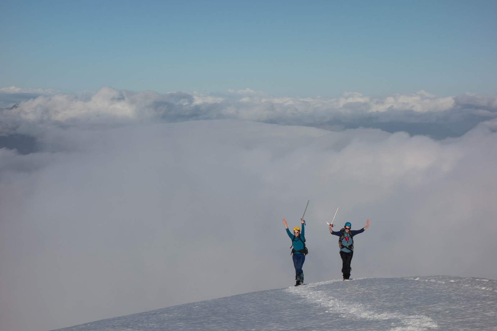There was quite a lot of cloud hanging around the top of the peaks, but the wee glimpses of blue I kept seeing above made me think we might just pop out of it on top. Sure enough, after winding up some gentle snow slopes and climbing across some 'plate like' boulder fields we popped out of the cloud on the gentle curving snow ridge to the top of Tara Tama. It really was majestic and we whooped with delight, what better place to be than here?